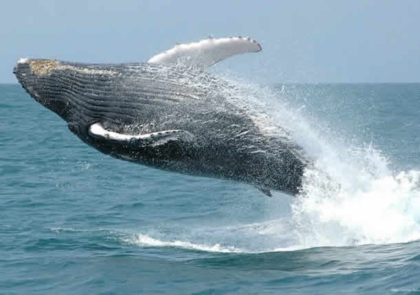 Alguns adultos apresentam marcas claras no corpo, acima das nadadeiras peitorais, em forma de parêntesis. A nadadeira dorsal é alta e falcada e localiza-se atrás do meio do dorso. Apresenta de 50 a 70 pregas ventrais, que não chegam a se estender atrás do umbigo. A cabeça é estreita e pontiaguda, com apenas uma quilha central. Possui de 105 a 415 pares de barbatanas que medem cerca de 30cm e são de coloração branco-amarelada, cinza-escura ou preta. O borrifo é indefinido ou pouco definido em forma de coluna e atinge cerca de 2m de altura.